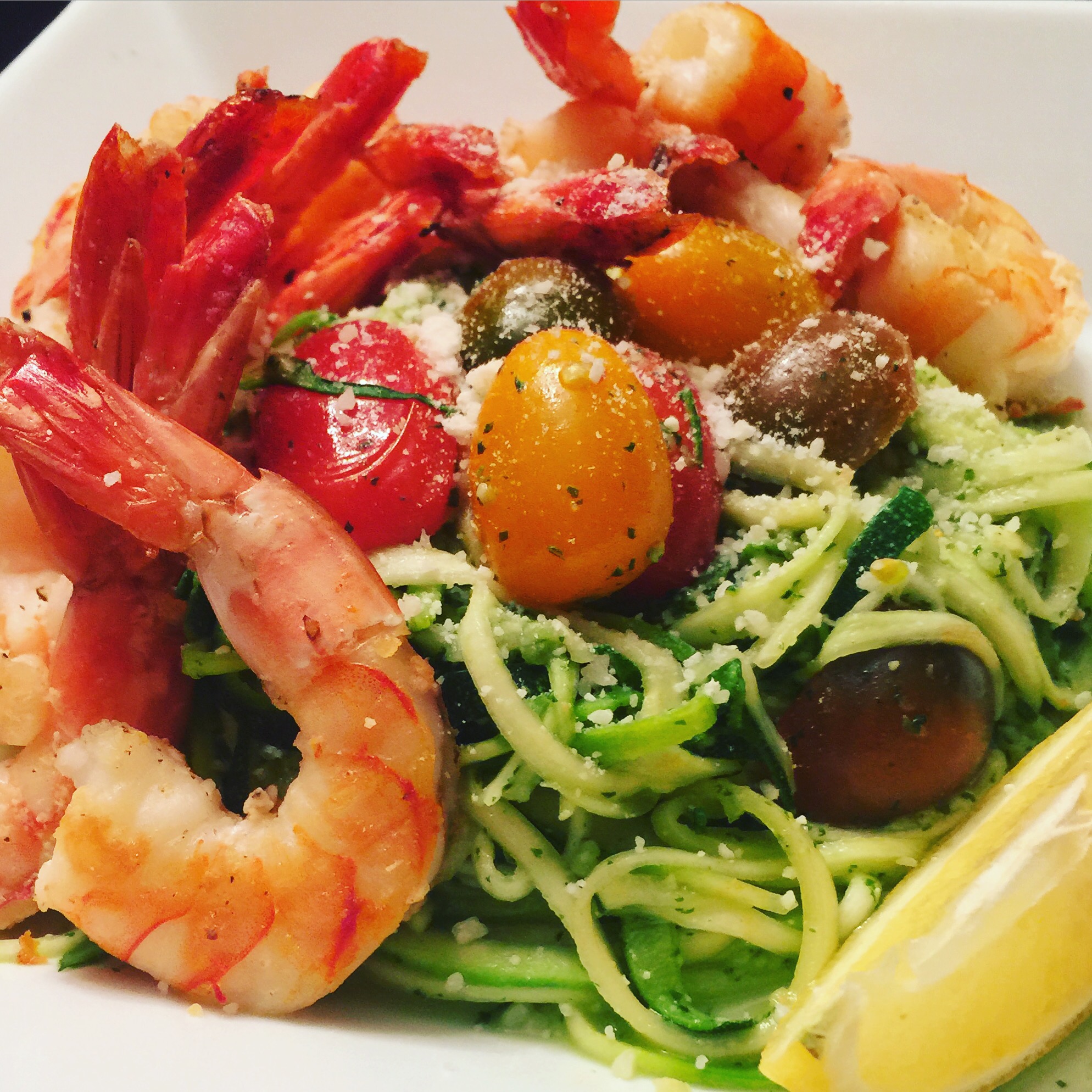 Pesto Zoodles with Grilled Shrimp of Chicken and Tomatoes